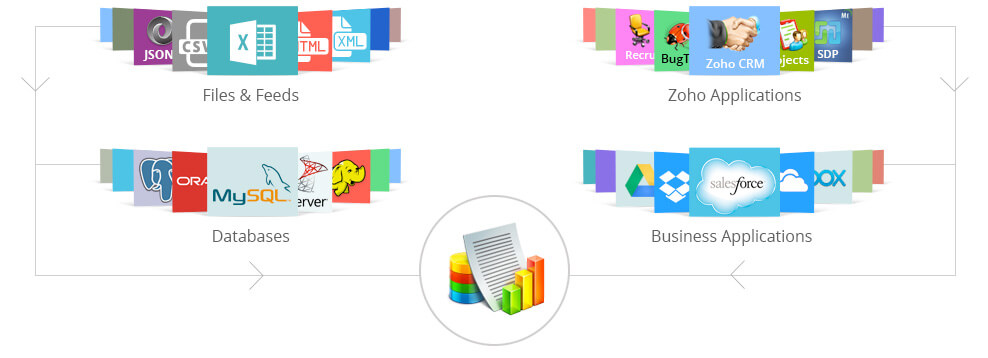 如今,业务数据散布在平面文件、Web 信息源、数据库、云存储服务以及线上/线下应用程序中。无论数据位于何处,您现在都可以使用 Zoho Reports 进行深入分析和报告。数据同步自动完成,并可以安排为定期执行。