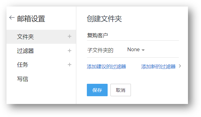 另外,还可以在SalesInbox首页主菜单的左侧面板中点击文件夹后面的添加图标来创建文件夹。 - 在创建文件夹页面中,执行如下操作: