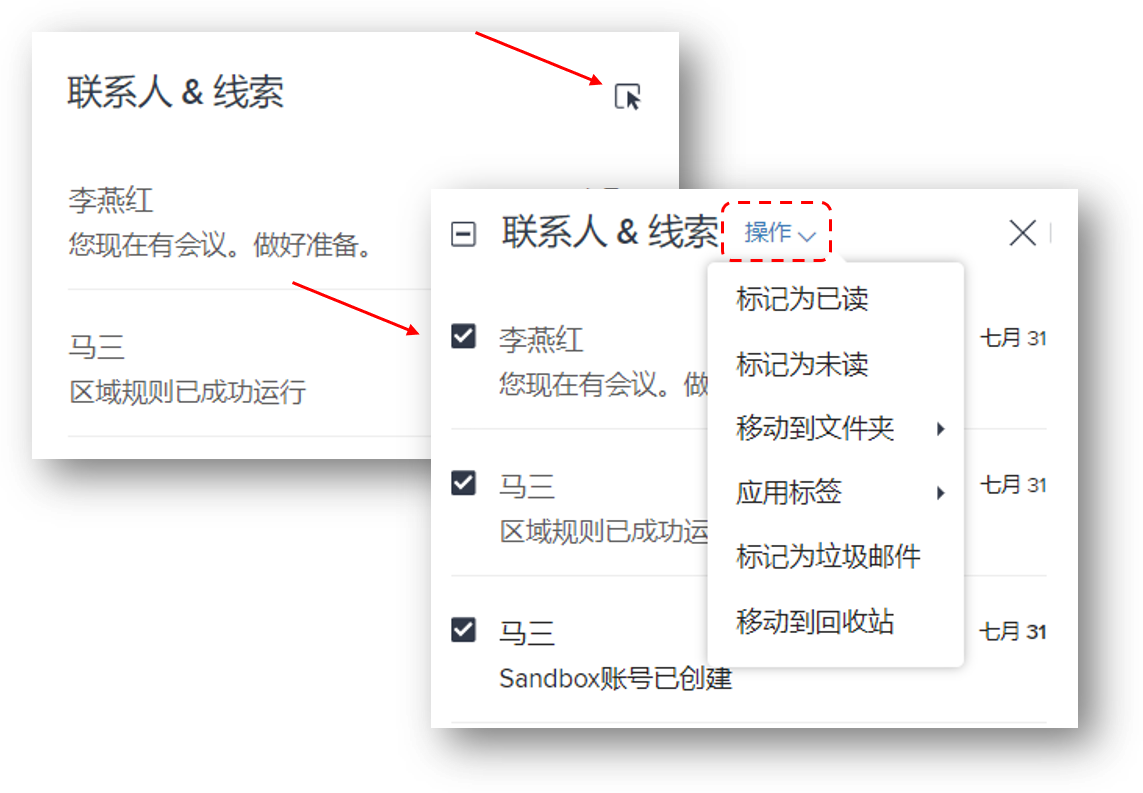 - 批量选择邮件:当您在CRM的邮箱视图名称后面移动鼠标时,将会看到带箭头的选择图标。点击此图标时,邮件前面会出现允许批量选择的复选框,选中多封邮件之后可以执行批量删除或者批量标记为未读等操作。