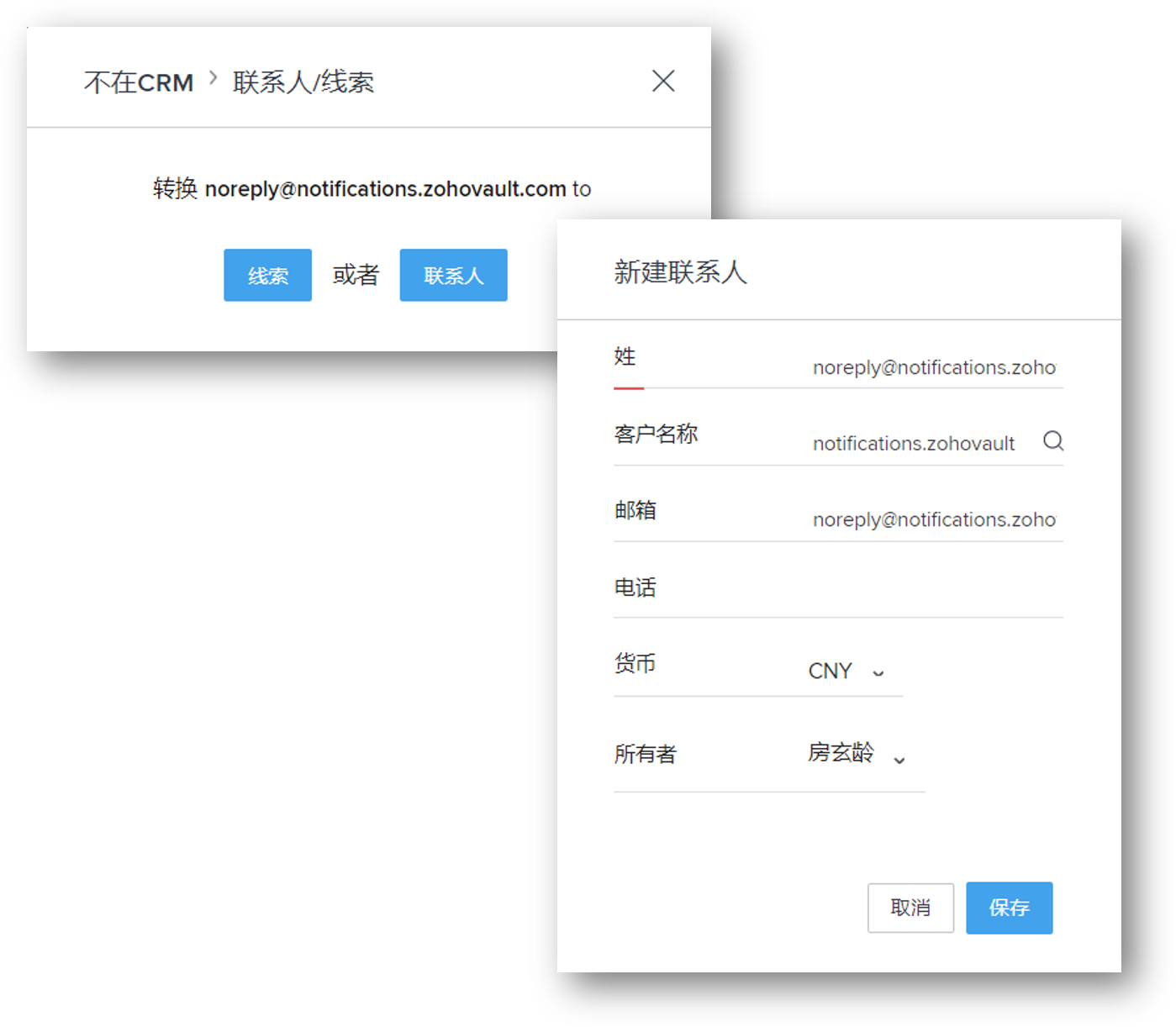 - 快速移动邮件到新的分类- 要将不在CRM中的联系人转换为线索/联系人或同事,只需从不在CRM视图列中拖拽邮件并放置在线索/联系人或同事列。将有弹出窗口提示您输入所需要的信息并执行操作。