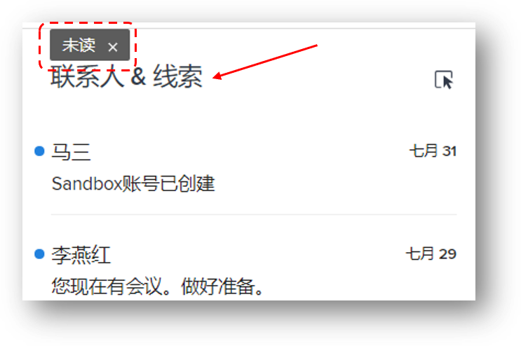 - 快速查找未读邮件:要快速访问未读邮件,只需鼠标单击您想要查看未读邮件的CRM视图名称,即可列出此视图中未读的邮件并在视图名称上方显示“未读”标签。