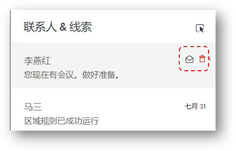 - 标记邮件为已读/未读或删除邮件:将单封邮件标记为未读/已读状态的快捷选项是:鼠标移动到单封邮件标题后并选择邮件图标。要删除邮件,点击删除。