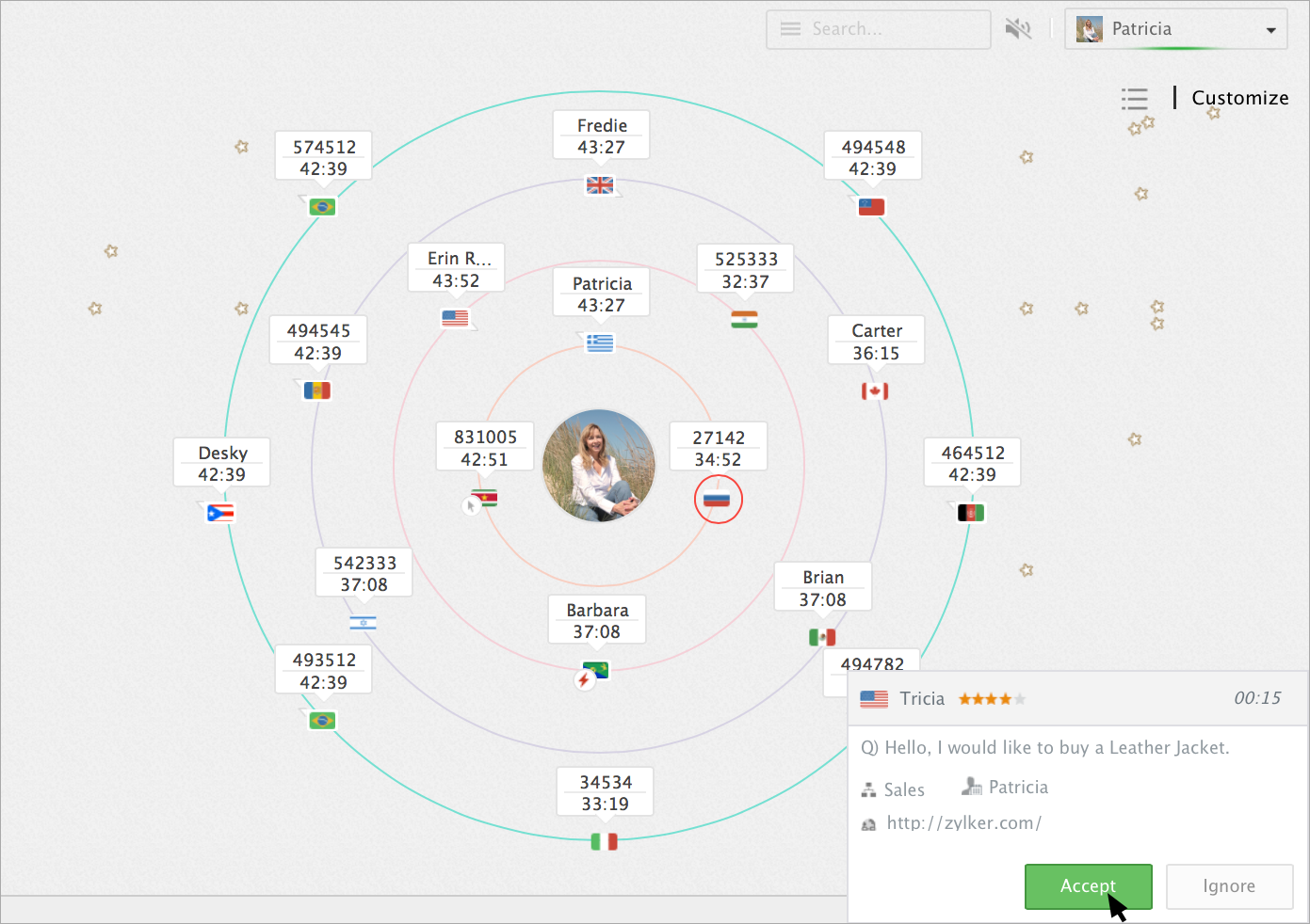 当访客发起聊天时,聊天请求将会弹出,其中会显示访客名称/随机 ID 和问题。点击接受按钮以应答聊天。