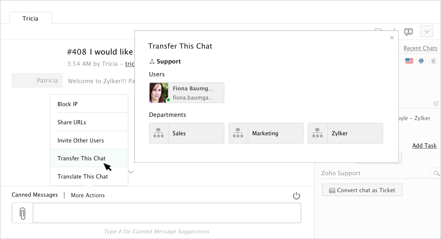 因为对于回答一个特殊的问题你不能总是正确的人, 或者一天之中你总要休息或离开, 我们提供给你能力把目前的聊天转移给其他用户。