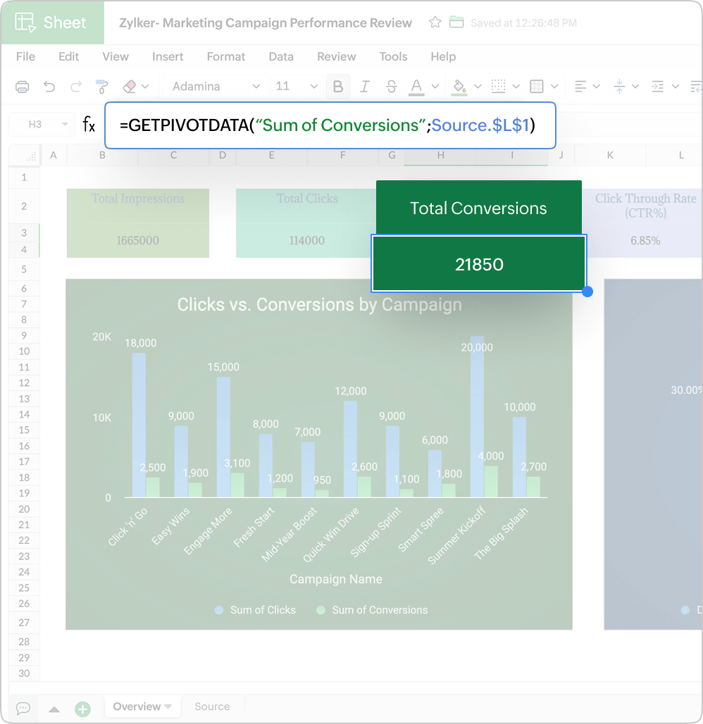 GETPIVOTDATA() 函数可帮您动态地从数据透视表中获取汇总数据,而无需手动定位值,即使数据透视表的布局发生变化也无妨