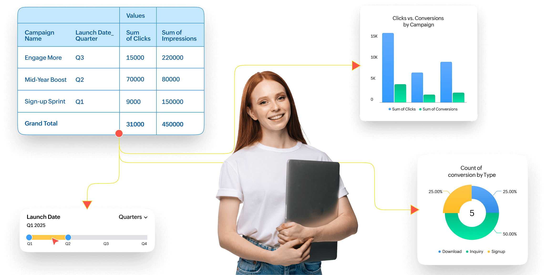 数据透视表与交互式可视化元素(如数据透视图、切片器和时间轴)搭配使用效果最佳,可创建实用且具有吸引力的电子表格仪表板。