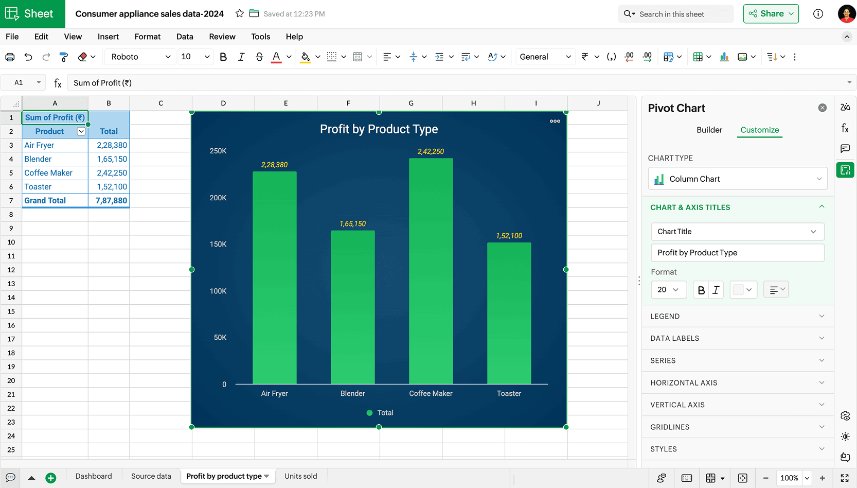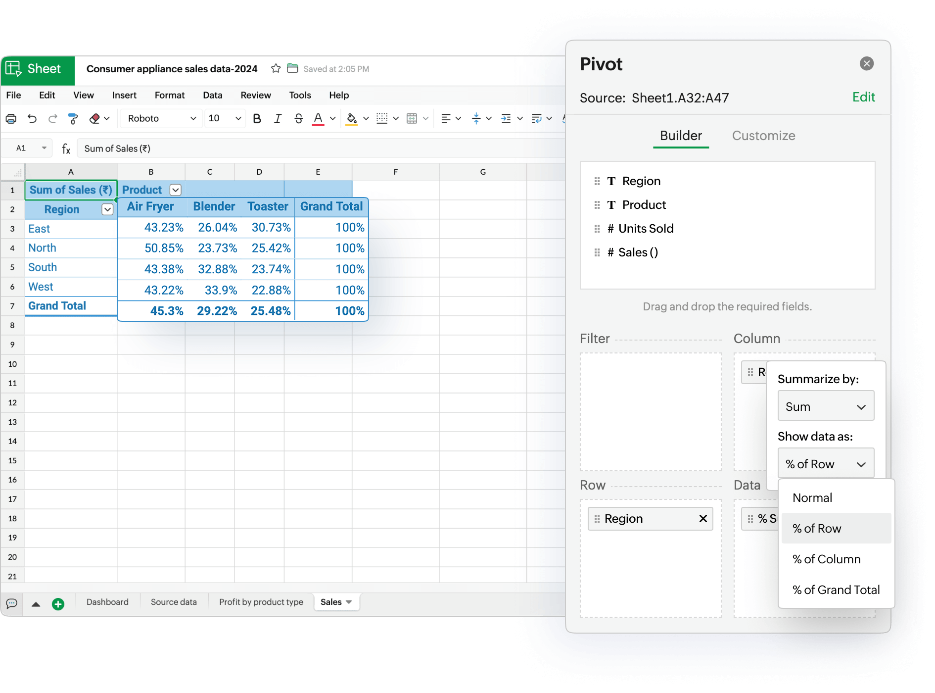 除了分组数据外,数据透视表还允许您添加小计,查看各组对整体的贡献,或将值显示为行列百分比,从而快速发现趋势并更深入地了解数据。