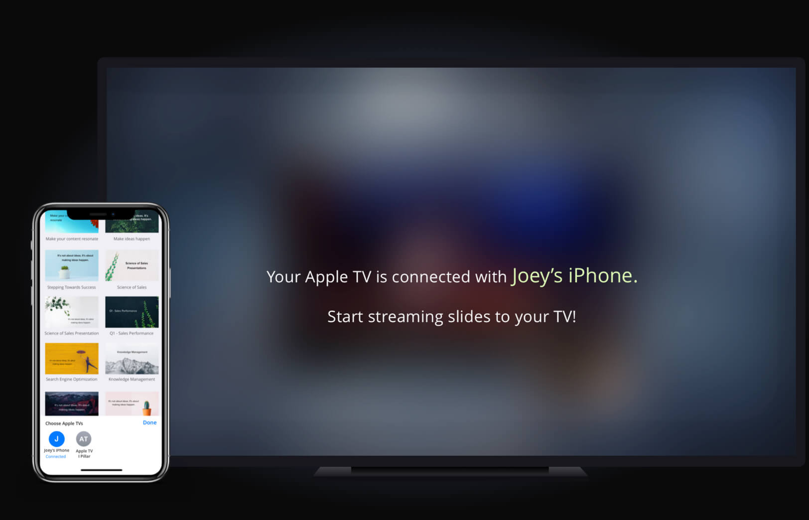 利用Zoho Show 应用,可在Apple TV的 4K HDR 显示器上清晰呈现您的幻灯片。Zoho Show 的矢量图形渲染可确保您的幻灯片在任何屏幕上都显得干净、漂亮。