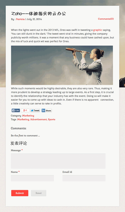Zoho Sites为您的网页提供了博客,您可以与您的访客进行更多的互动。