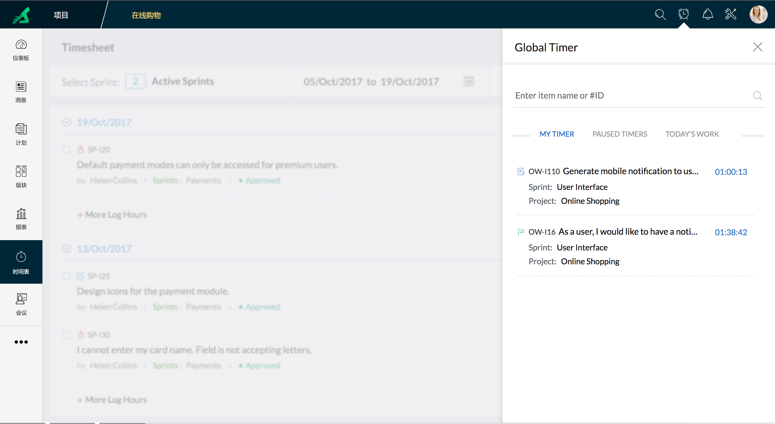 选择工作项,并启动计时器,开始记录工作时间。 也可以暂停或停止计时。