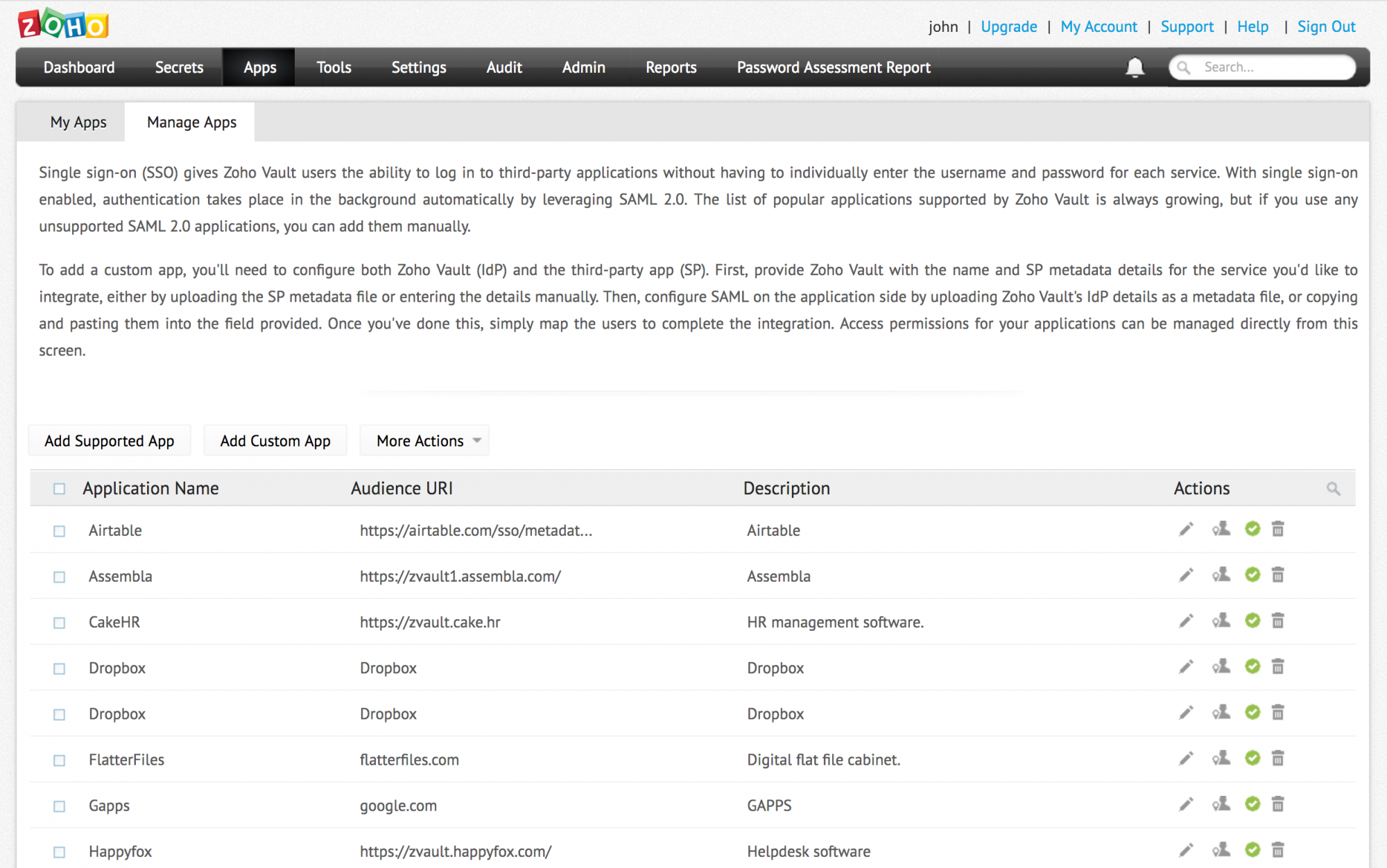 - Zoho Vault SAML 目前支持许多主流应用程序,支持的应用列表还在不断增长,您可以使用添加支持的应用选项来激活应用程序。对于每个应用程序,您可以在帮助文档的这个部分找到逐步说明。