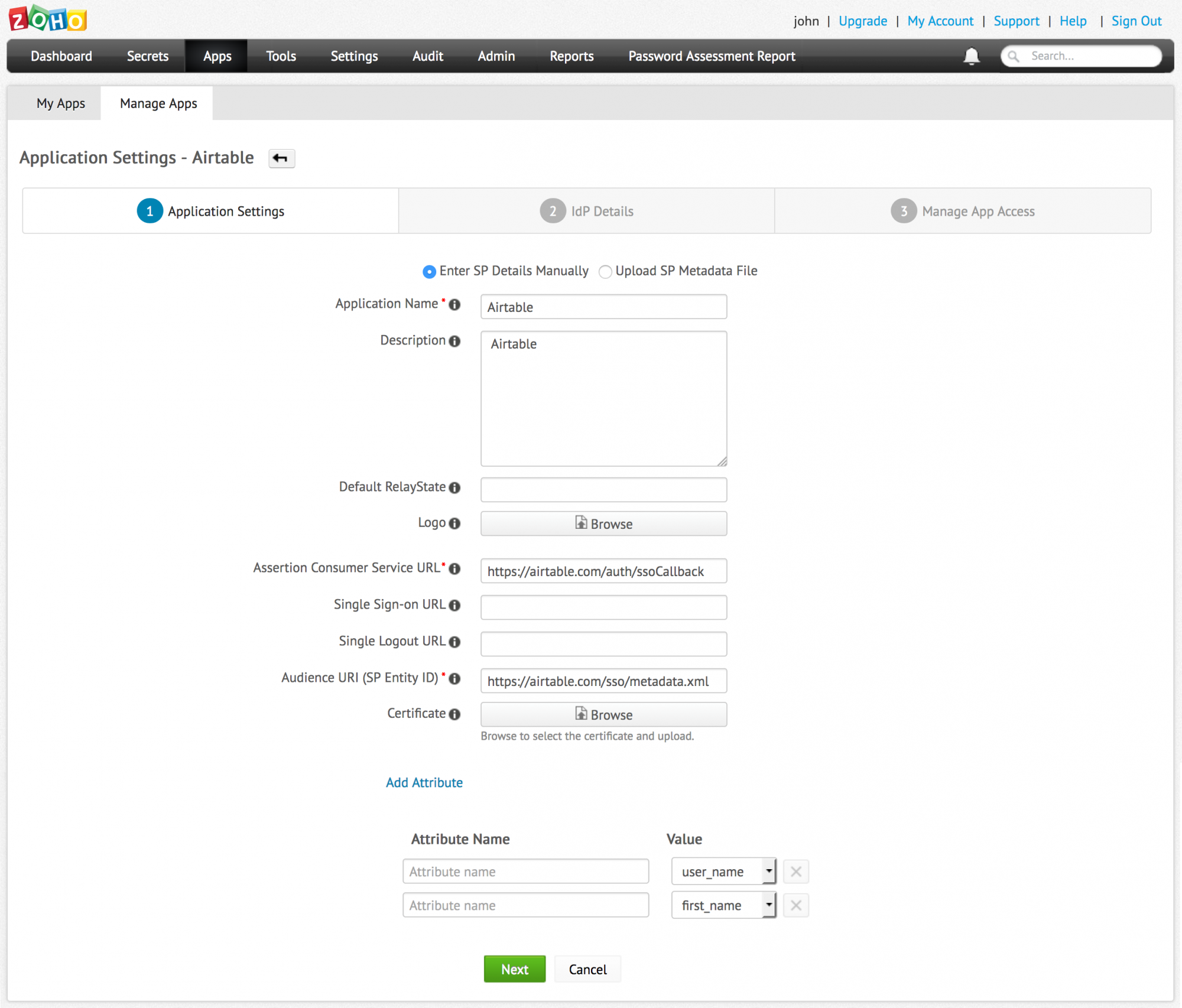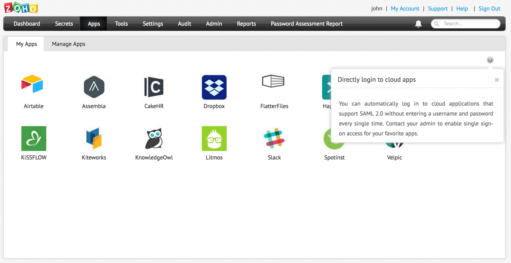- 通过提供所有应用程序的详细信息以及为用户设置访问权限,管理员为 Zoho Vault 中的各种应用程序配置单点登录。