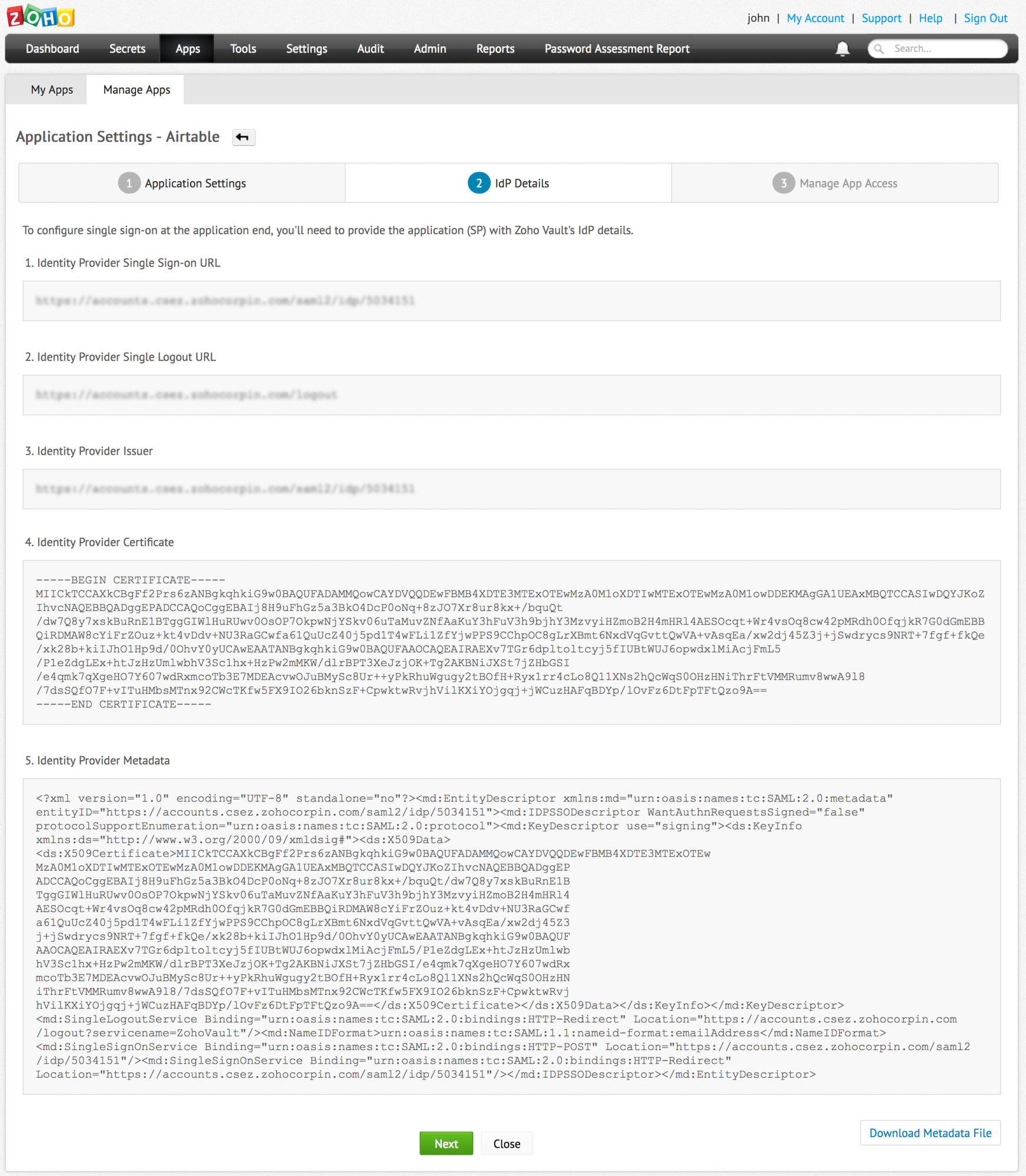 要完成与应用程序的联合单点登录配置,您需要向应用程序 (SP) 提供 Zoho Vault (IdP) 的详情。您可以从此处复制所需的配置详情或将它下载为元数据文件。