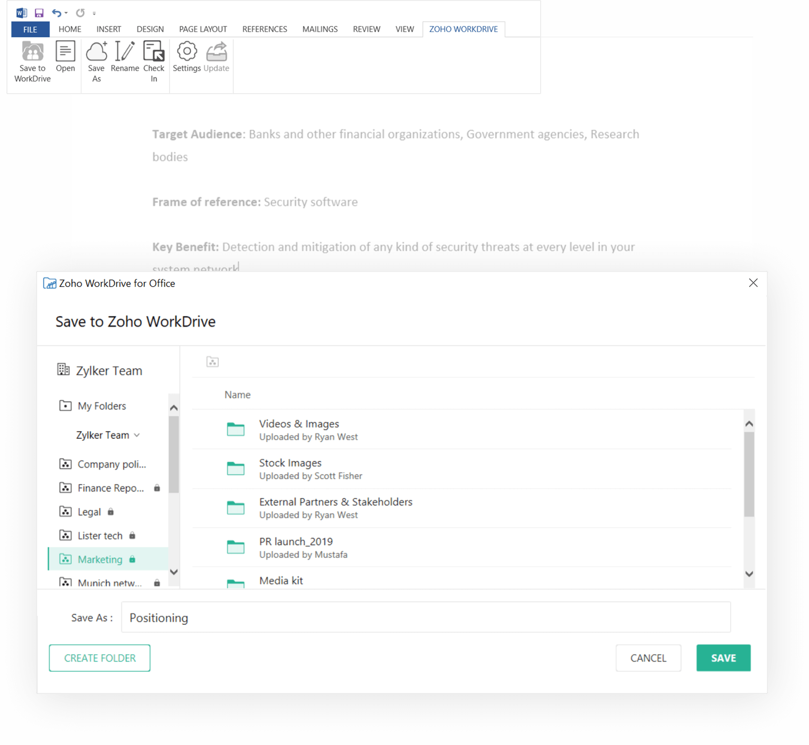 直接从 WorkDrive 保存并打开文件,或与同事共享文件,而无需将 Microsoft Office 文件转换为 Zoho 格式。
