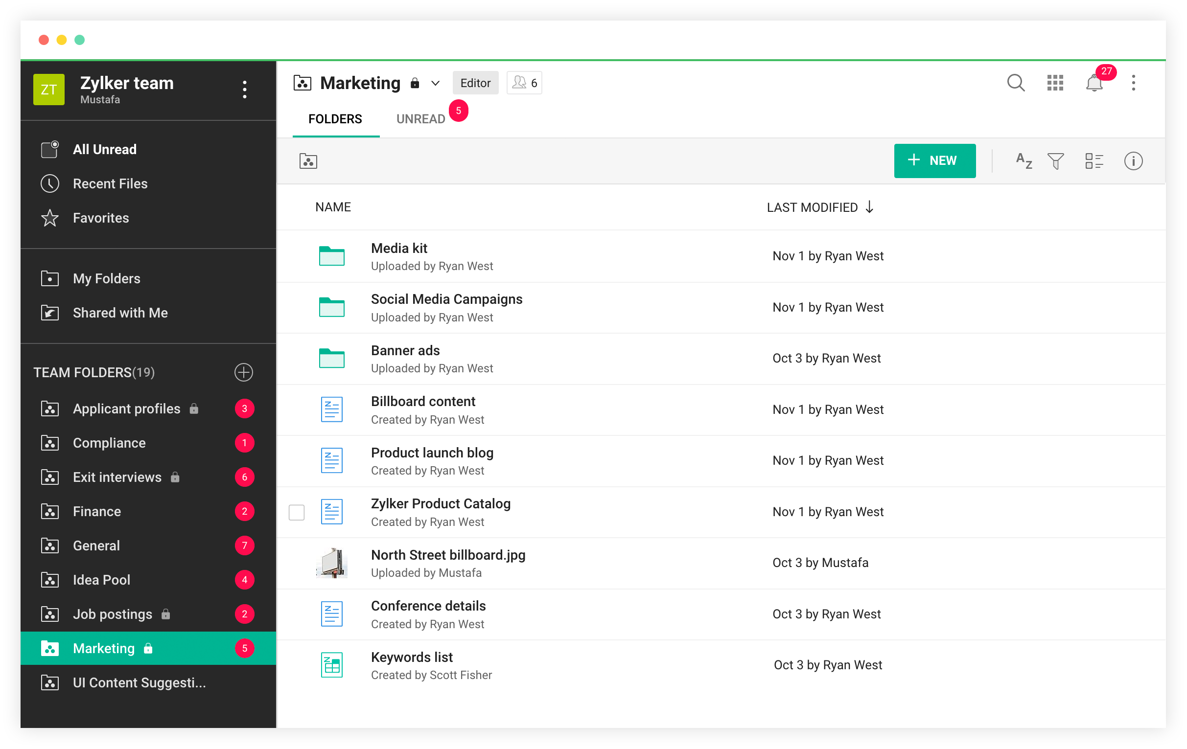 根据团队成员在其团队中的角色,向他们赋予团队文件夹中文件的相应访问权限。从管理员、组织者、编辑和观看者等一系列成员角色中进行选择。
