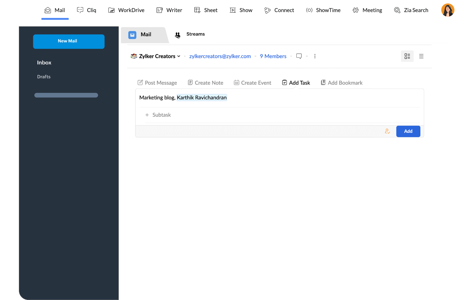 Workplace套件中程序都能无缝集成,所以您不必在不同的应用程序中来回切换就能完成工作。例如,您在Zoho Writer页面也能接收和回复Cliq消息。