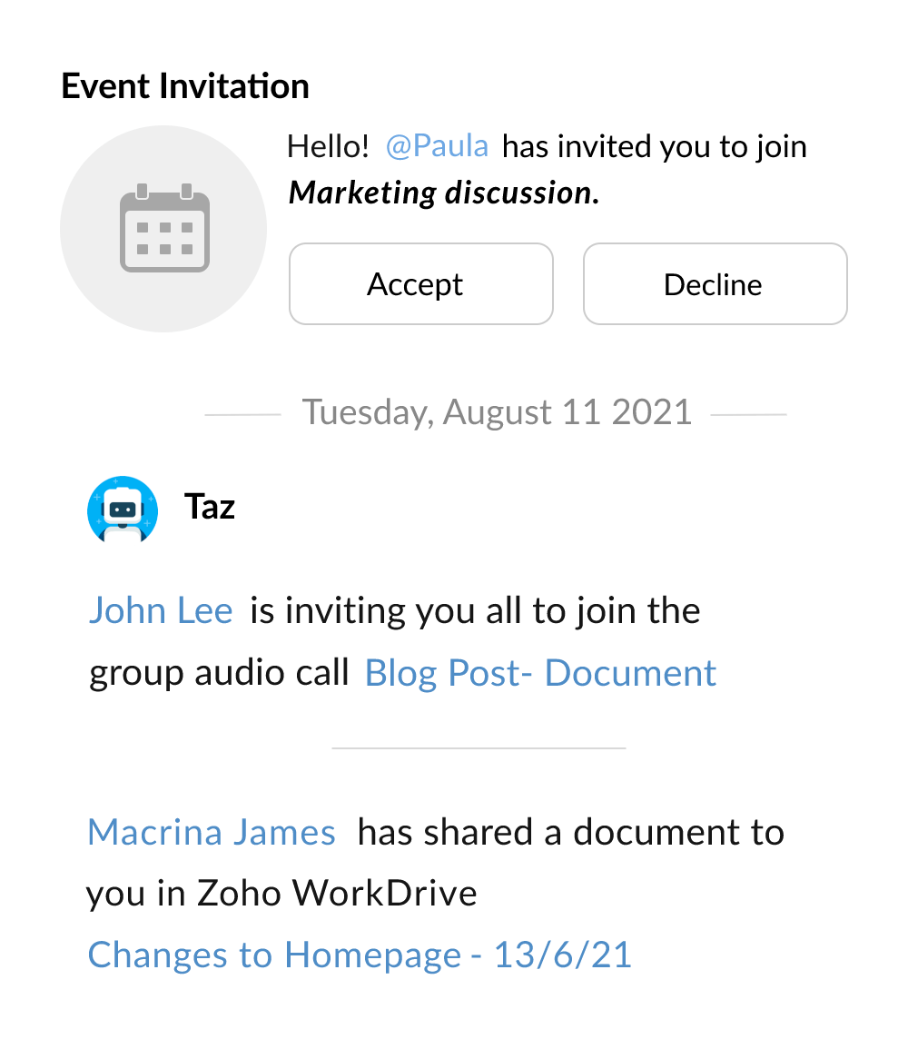 Taz 是 Workplace 的内置机器人,当有任何文件与您共享时,或者活动通知,都可以及时向您发出提醒,避免错过重要的信息。