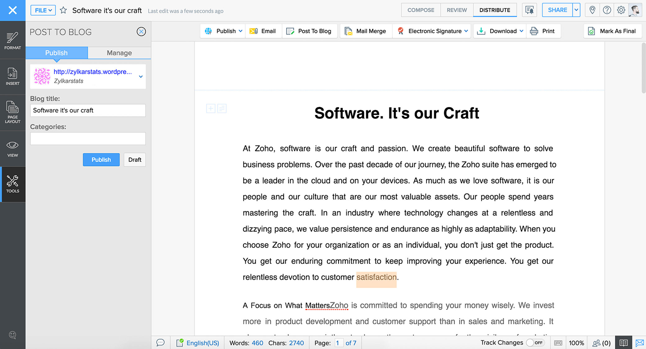 博主可以轻松地通过在线Word编辑器Zoho Write发布文档。