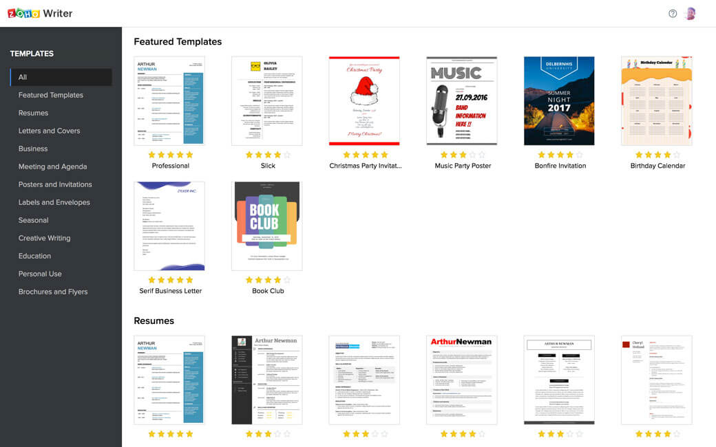 无需自己对文档进行排版。web端免费在线Word编辑器Zoho Writer提供大量模板,可供选用。
