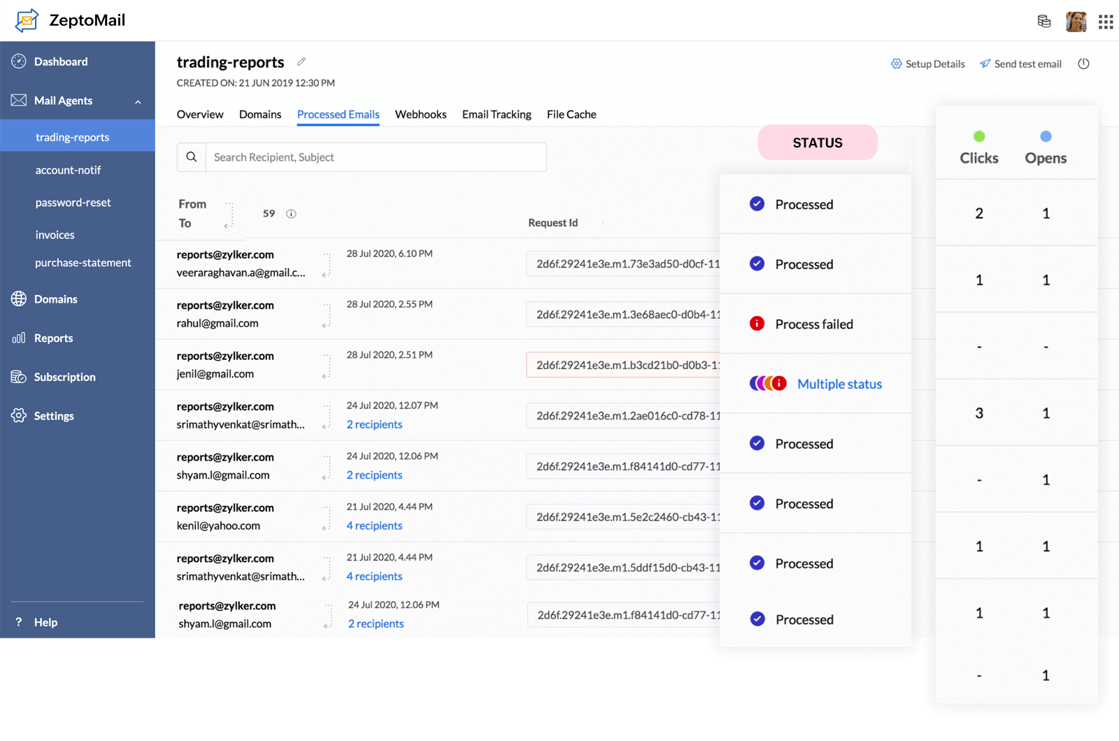 需要对问题邮件进行故障排除吗? ZeptoMail 提供详细信息,来分析邮件的性能,查看已处理电邮件日志中每封电子邮件的状态、收件人、退回详细信息、点击次数和打开次数。
