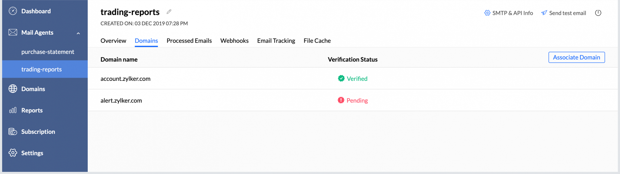 您可以在邮件代理的域选项卡下关联您的域。在本部分中,可以列表形式查看所有关联的域。您还可以在此处查看关联域的验证(SPF 和 DKIM)状态和退回地址详细信息。