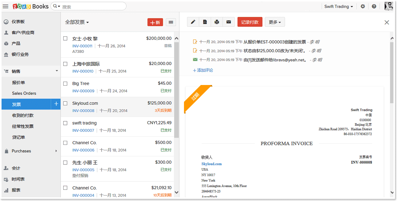 Zoho Books可直接把invoice中的款项一键记录收款,用以财务记账,你可以把PI和收款关联起来。