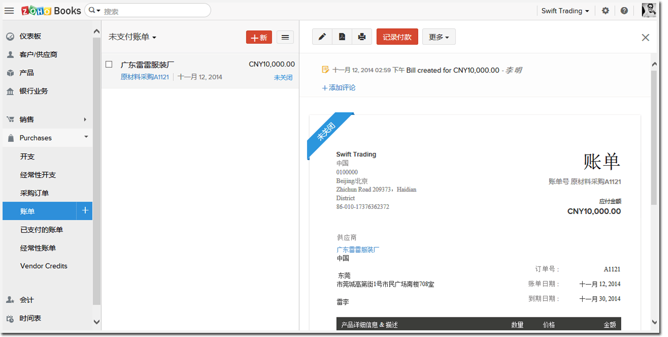 在ZohoBooks可以记录产品的采购成本、房租等日常开销、以及各种费用开支。