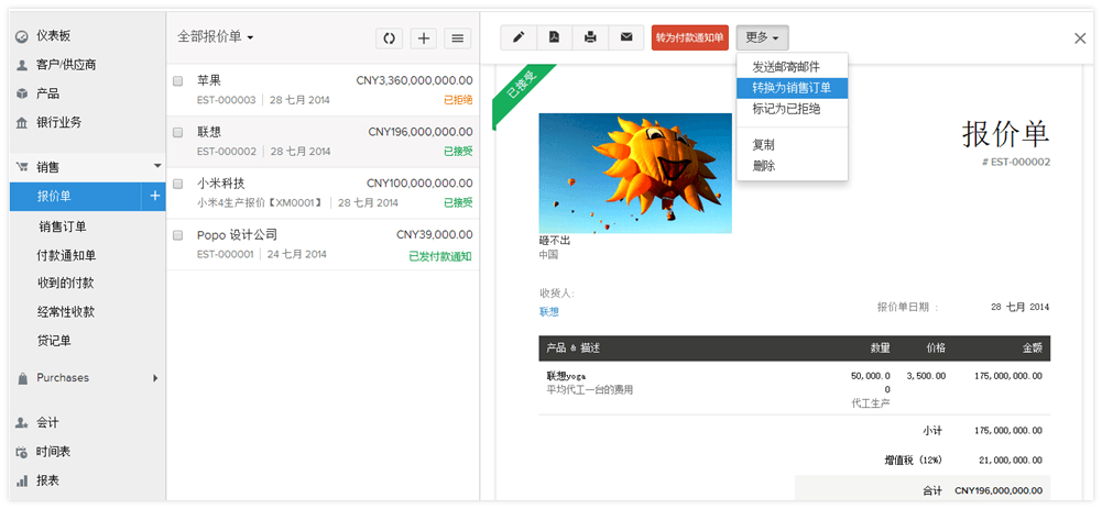 轻松创建报价单,一键点击,即可转换为订单、PI,可轻松查看交易的阶段与状态,所有单据集中存储在云端,效率远胜word、Excel。