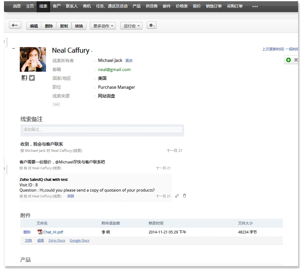 Zoho CRM集成了Twitter、Facebook,可在CRM中集中查看客户在社交网络的最新动态,便于及时了解、维护。