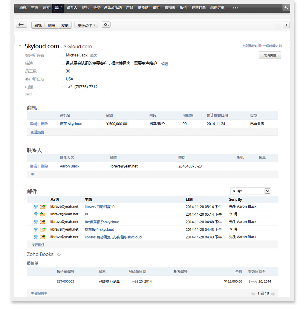 Zoho CRM是一款在线客户管理软件,它可以帮你记录通过邮件、网页表单、