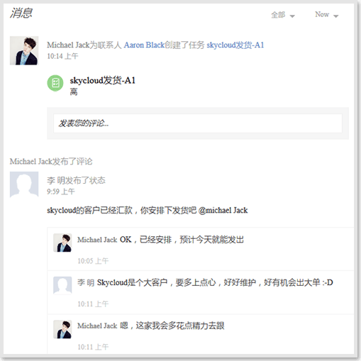 Zoho提供了微博式的消息对话,你只需发布消息,然后“@”对方,即可进行任务分配与审批。