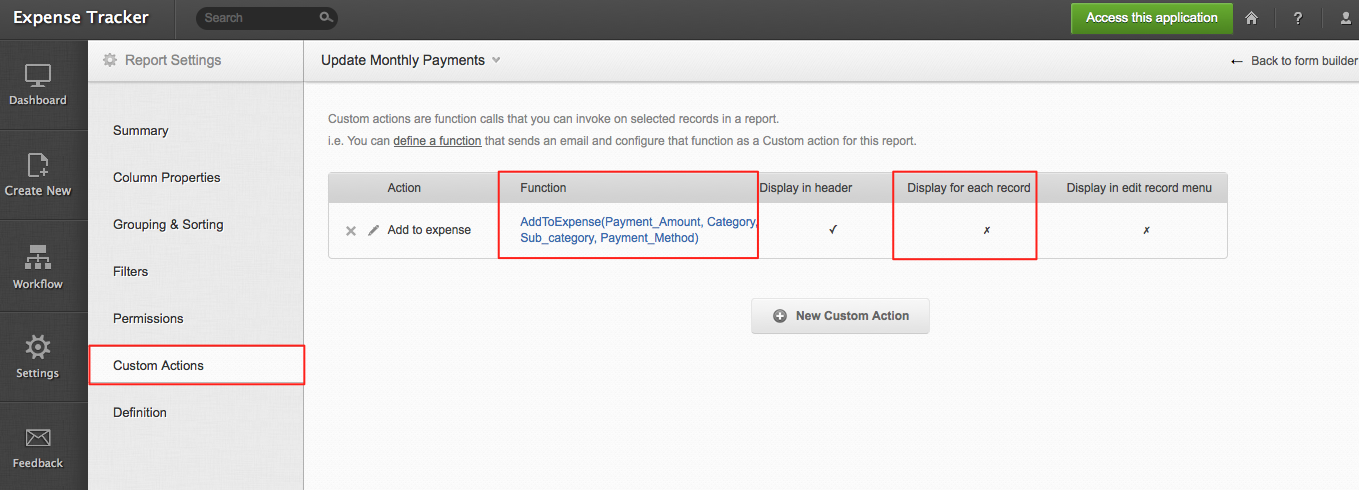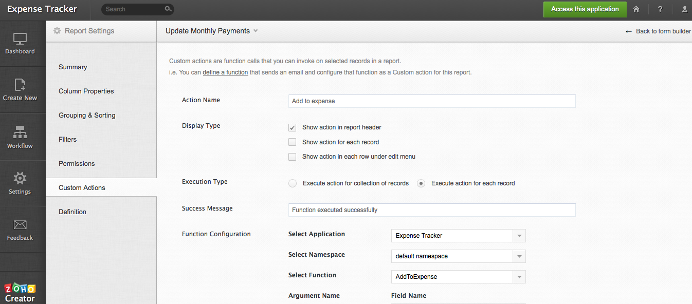 “自定义动作”是集成在 ZC 视图中的一个功能,让用户能够对视图中的所选记录调用特定的用户定义函数。在这个应用程序中,“Add to expense”自定义动作按钮调用函数,该函数基于指定值将新记录添加到 Expense 表单。