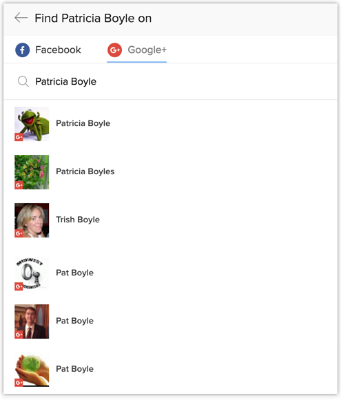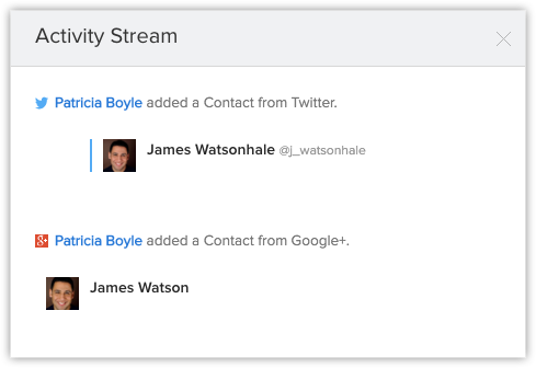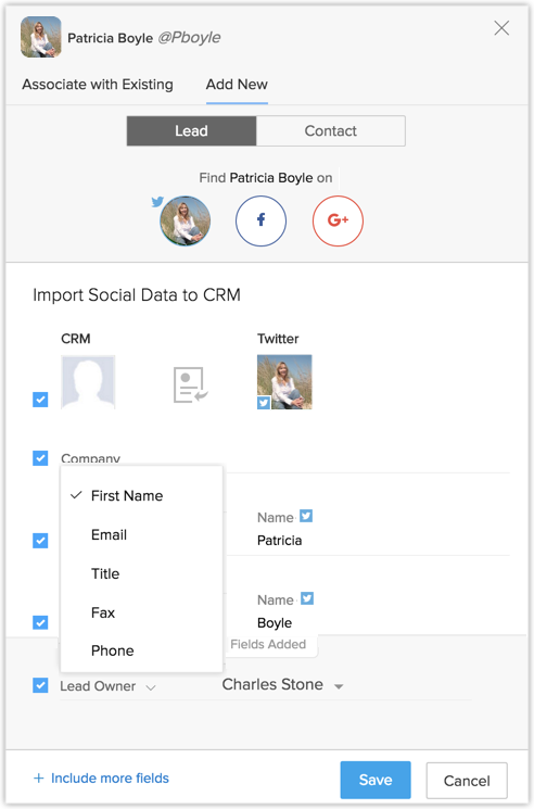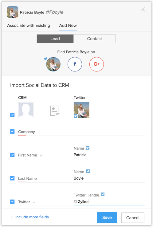 - When you add a lead/contact from your company's Twitter handle, Facebook page, or Google+ page associated within CRM, the lead's or contact's Twitter, Facebook, or Google+ profile will be automatically associated with the record.