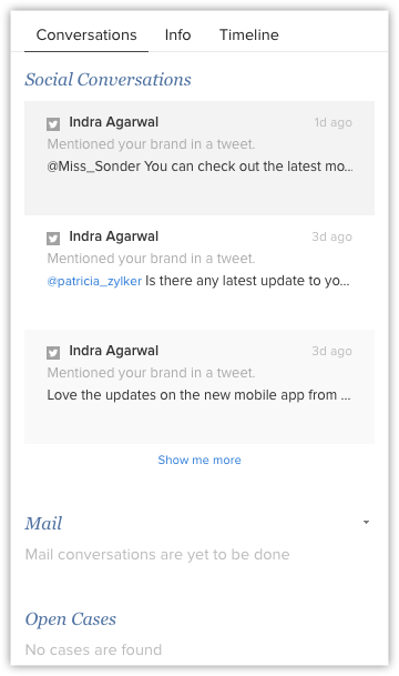 - Conversations - These include social and email conversations. Any open cases are also listed.