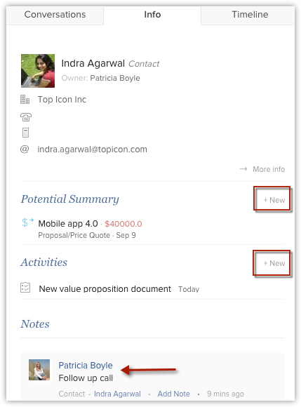- Info - All the details about the contact that is stored in CRM such as email address, phone number, website, potentials, notes and tasks. You can add a new task, note or a potential from this section.
