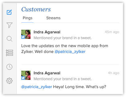 - Pings - These are posts in which your business/brand has been mentioned. This includes Mentions and DMs on Twitter, comments, replies and private messages on Facebook and Google+.