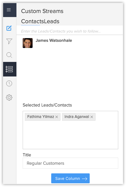 Later, all you would need to do is refresh the search column to see the latest posts surrounding the keywords saved. - Customize the CRM View by adding Custom Streams to follow important customers. Search for those special leads and contacts and save your Custom Streams.