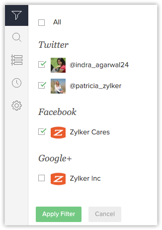 Leads and contacts added to Zoho CRM from Facebook, Twitter and Google+ via these social automation rules can be identified from the Lead Source field. For instance, you will see that a lead added from Twitter automatically has the Lead Source filled up das "Twitter". You can filter records based on Lead Source if you wish to see leads and contacts generated from social media.