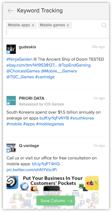 - Keyword tracking lets you search on Twitter for a few specific keywords and save the search results. For instance, if you are in the mobile app development business, you can search for topics such as mobile app development, iOS devices, Android devices and so on. These search results will be saved as a new column in the CRM view. Whenever you refresh posts in this column, you will be kept updated about what is being talked about these subjects on Twitter.