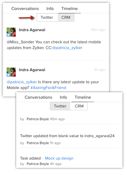 In addition to CRM Timeline, Twitter contacts will have a Twitter Timeline, which displays their tweets, retweets, mentions and replies.