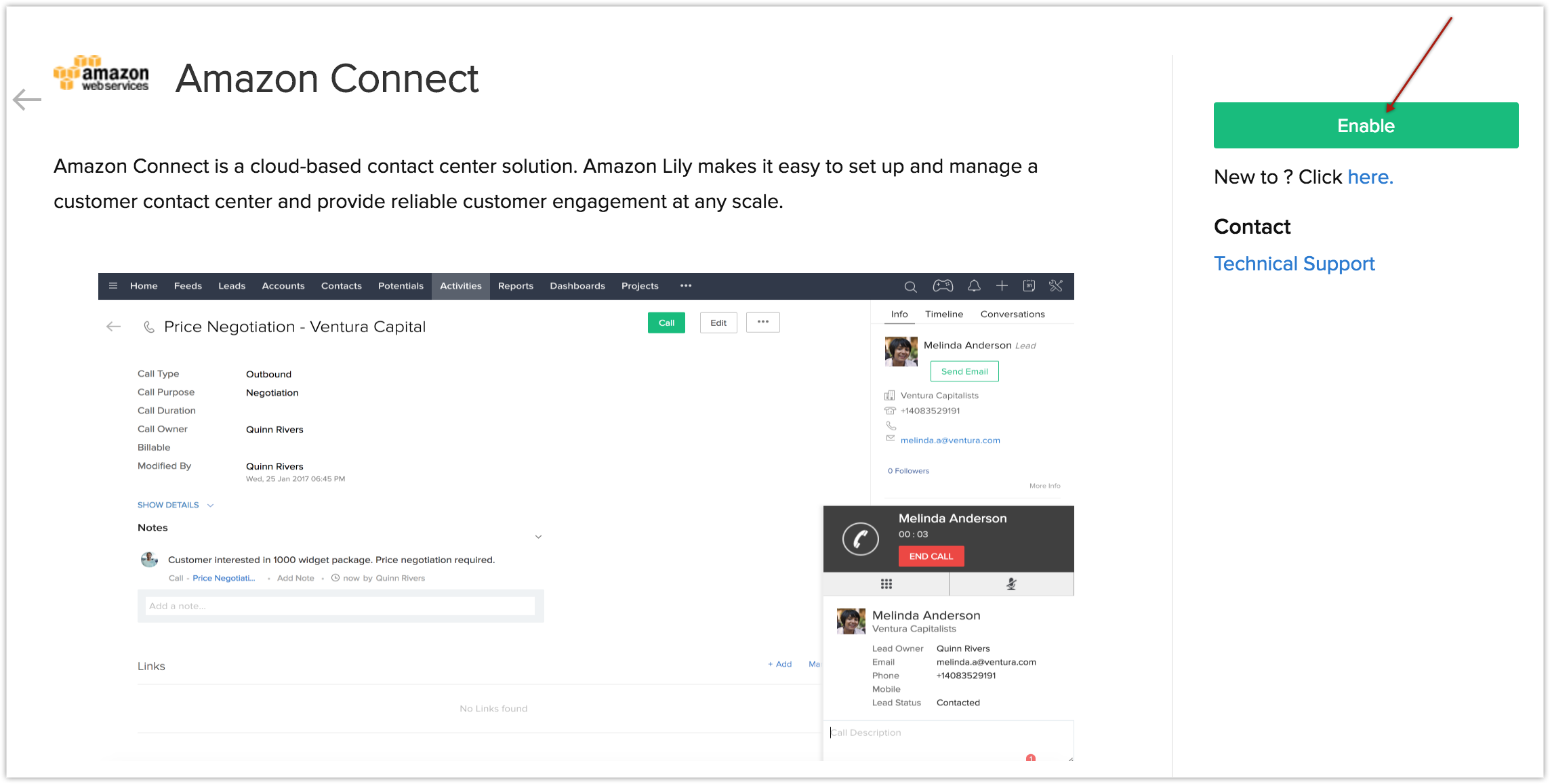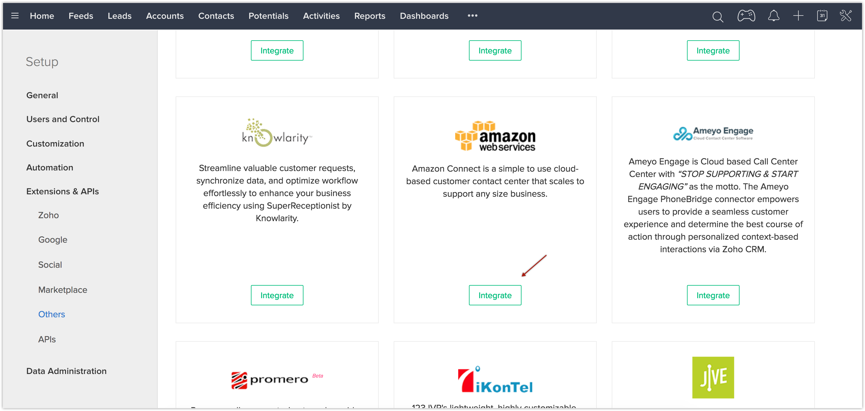 - 仅 Zoho CRM 账户管理员可以启用 Amazon Connect 集成。