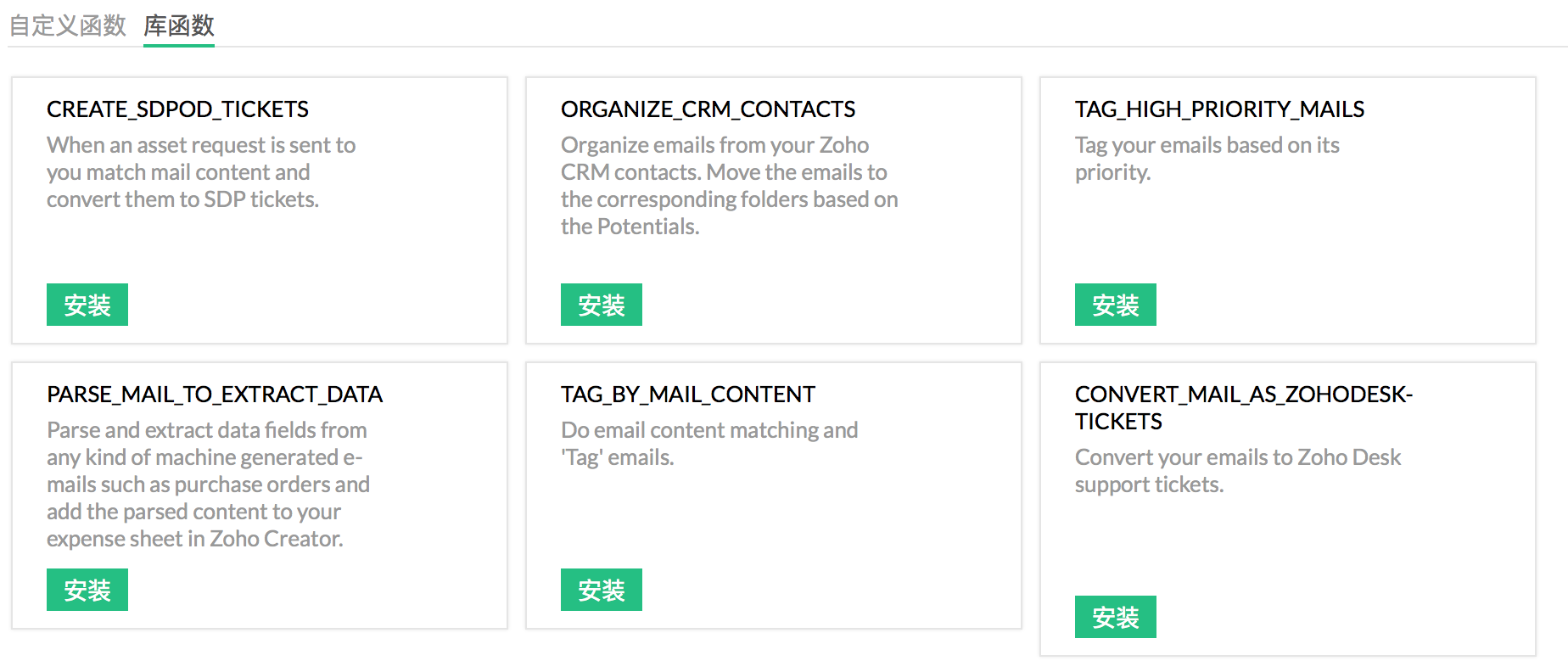 Zoho Mail 中的自定义操作支持可帮助您将 Zoho Mail 与其它 Zoho 应用程序或外部应用程序集成,并基于接收邮件创建工作流。