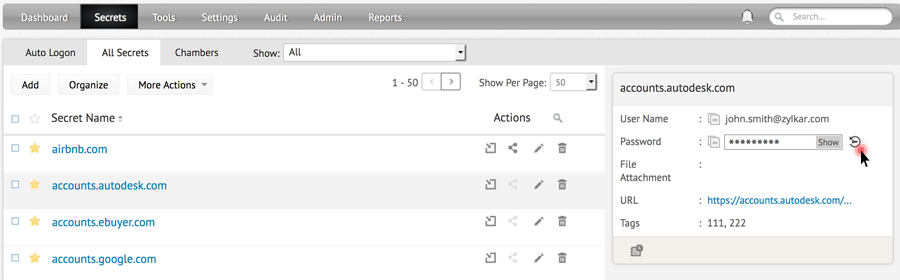 - 导航至机密信息 >> 所有机密信息页面,然后点击需要更改密码的特定机密。机密详情在右侧窗格中列出。