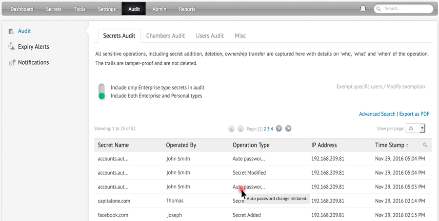 - 要查看密码重置的审计日志,请导航至管理 >> 审计 >> 机密审计。